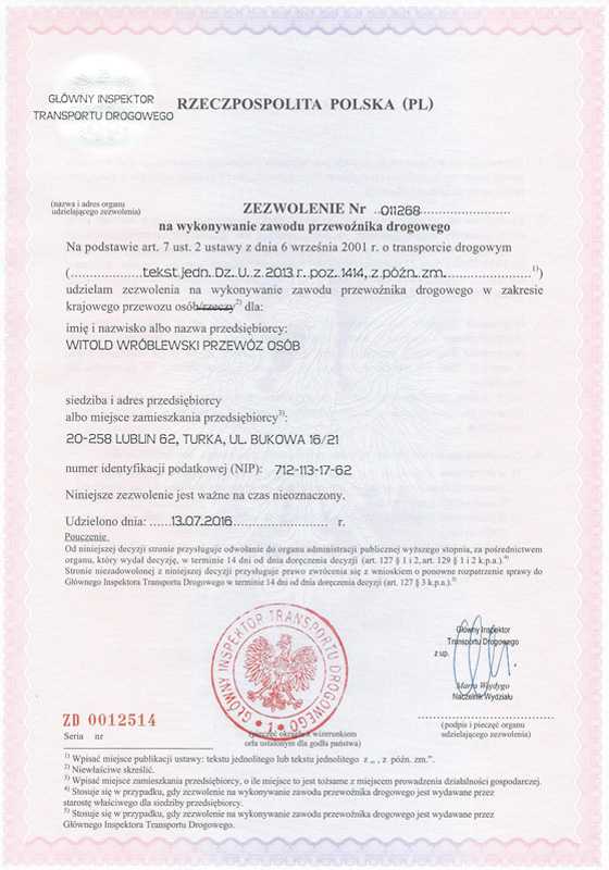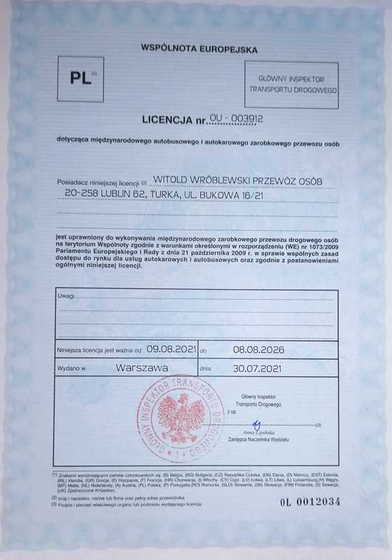 Firma posiada licencje Wspólnoty Europejskiej, wszystkie inne zezwolenia na przewozy osób na terenie całej Europy oraz certyfikat kompetencji zawodowych i ubezpieczenia.